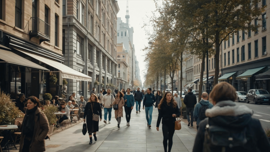About: Busy Canadian city street with people walking past cafés and shops, showcasing local businesses and community life in Vancouver